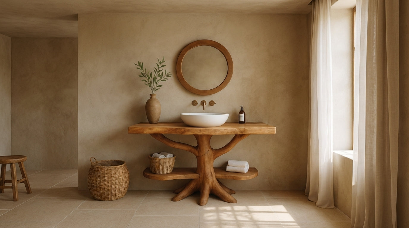 The solid wood countertop showcases expressive grain patterns and softly refined edges, enhancing the tactile beauty of a handcrafted wood vanity. This balance of organic texture and sculptural form allows the bathroom vanity to transition effortlessly between rustic vanity charm and clean, elevated modern bath aesthetics—making it a timeless focal point.