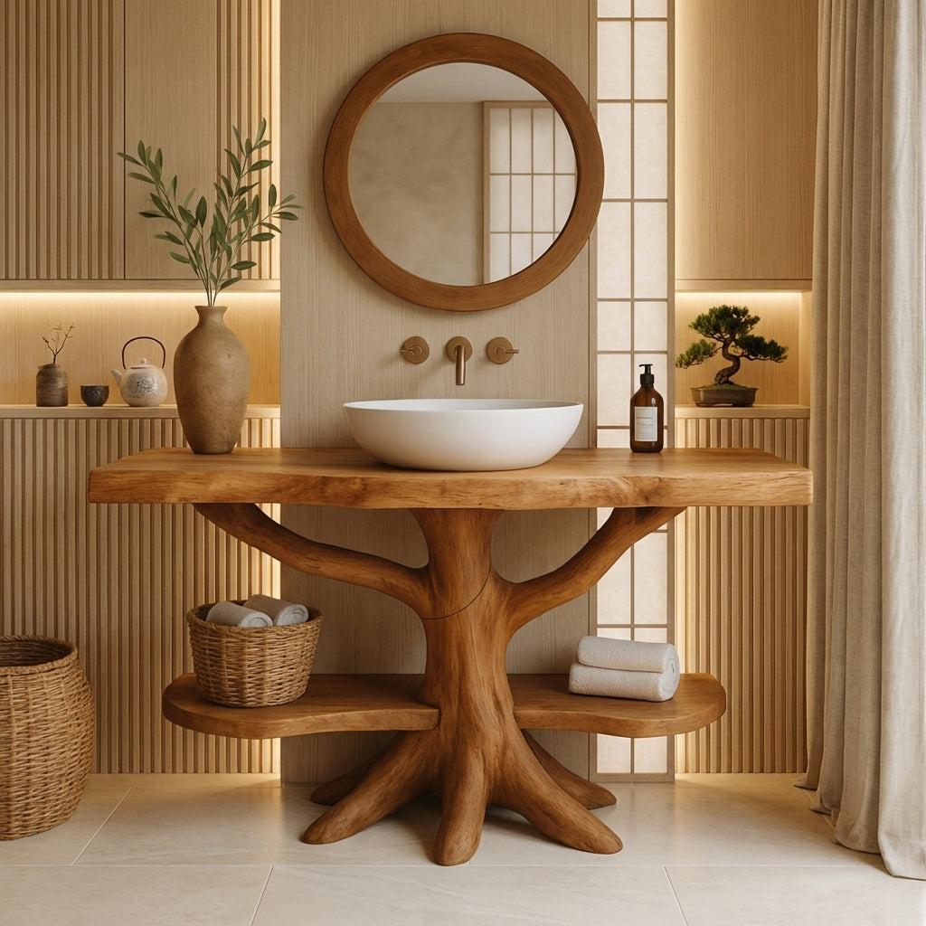 This rustic vanity is defined by its sculptural, branch-inspired base, evoking the organic movement of natural wood forms. The interwoven structure creates visual rhythm and architectural strength, transforming the bath vanity into a functional sculpture rather than a conventional cabinet.