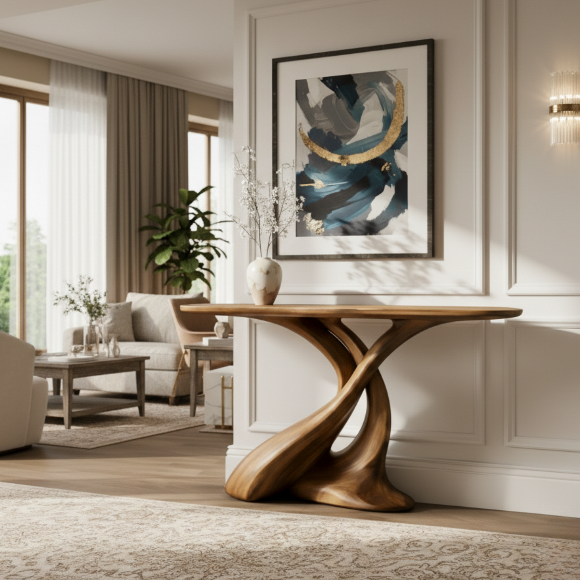 The console features a dramatic twisted base formed by two fluid, intersecting curves that create a continuous, ribbon-like silhouette. This sculptural structure introduces visual movement while maintaining balance and structural harmony. The negative space beneath the tabletop enhances lightness and architectural depth, making the piece feel both bold and refined.