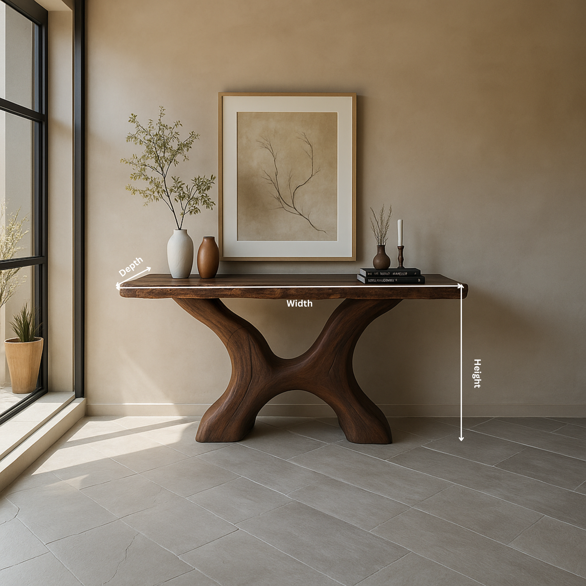 This handcrafted wood console table is a bold statement of Organic Modern design, merging sculptural artistry with timeless functionality. Made from premium solid wood, this console table works beautifully as a refined rustic desk, elegant dressing table, or distinctive antique console, bringing the character of live edge furniture into curated interiors.